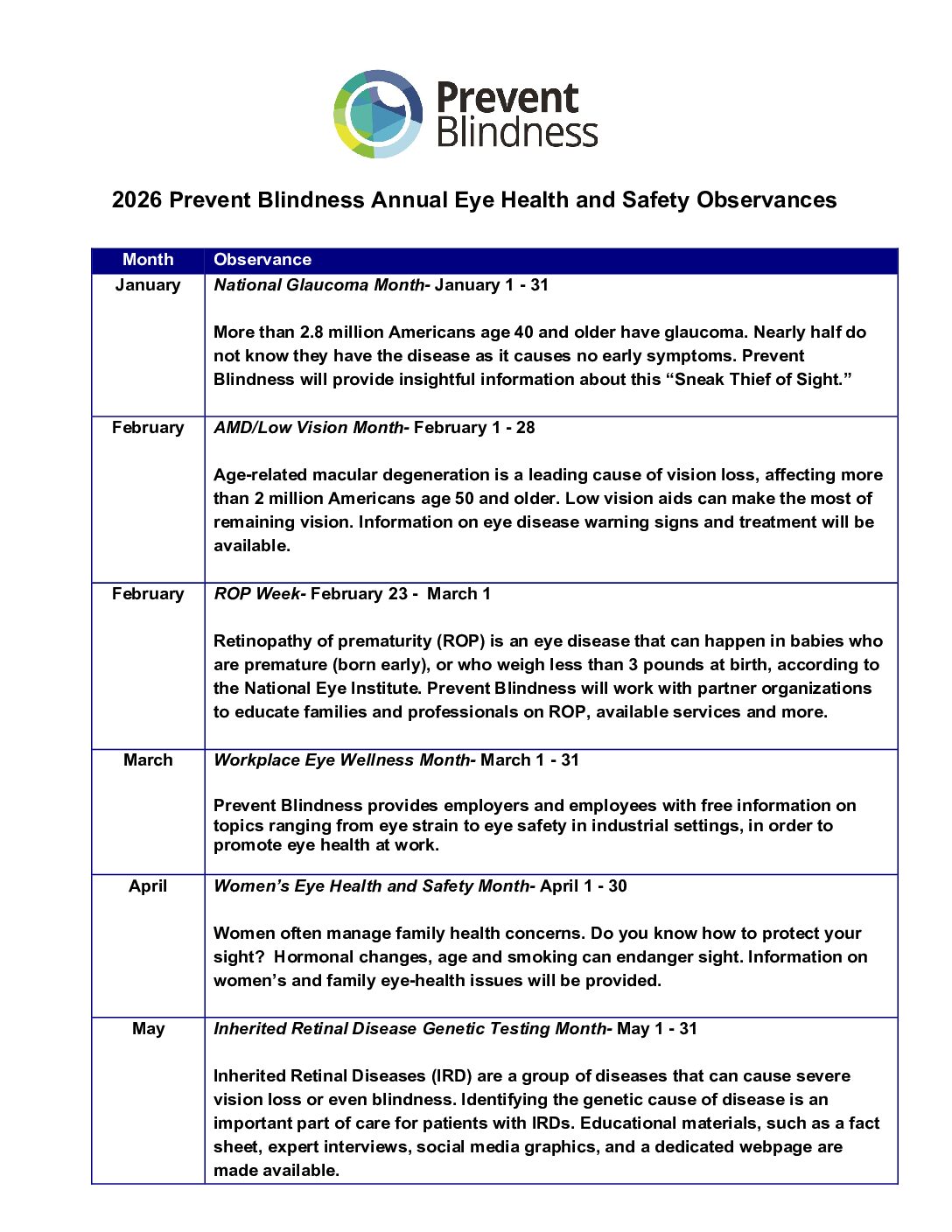 | Prevent Blindness Annual Eye Health and Safety Observance Calendar | documents fact-sheets resources-and-support | |